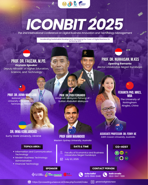 International Conference on Digital Business Innovation and Technology Management (ICONBIT 2026) hosted by Universitas Negeri Surabaya and will be held in Surabaya, Indonesia (Hybrid), on 18 December 2026. ICONBIT 2026 will be the most comprehensive conference focused on various advances in informatics and its applications. This conference provides an opportunity for academic and industrial professionals to discuss the latest issues and progress in the areas of informatics, computer science, information systems, information technology, and software engineering. The conference aims to bring together researchers, practitioners, and industry experts to share innovative ideas, cutting-edge research findings, and practical solutions in the rapidly evolving field of informatics. We encourage submissions that address both theoretical foundations and practical applications across various domains of technology. In addition, the conference will publish high-quality papers related to various theories and practical applications in informatics. Furthermore, we expect that the conference and its publications will trigger further research and technological improvements in this important subject. We are committed to making 2025 2nd BTS-I2C a conference of high quality and integrity. All manuscripts from our last conference The 2024 1st BTS-I2C have been published in IEEE Xplore, demonstrating our commitment to maintaining the highest standards of academic excellence and ensuring wide dissemination of research outcomes.